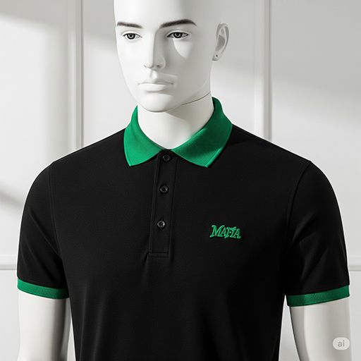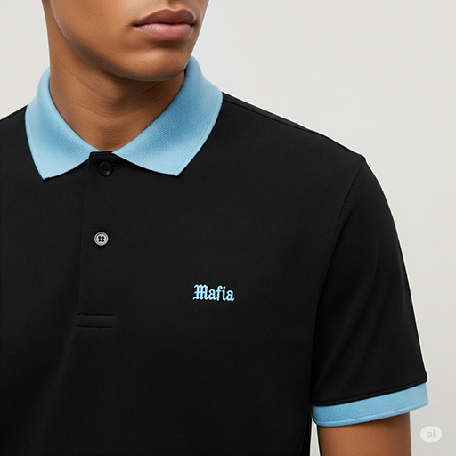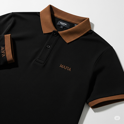 সাদা কন্ট্রাস্ট: কালো পোলো শার্টে সাদা কলার, কাফ এবং সাদা 'Mafia' লোগো, যা একটি ক্লাসিক এবং পরিশীলিত লুক দেয়।