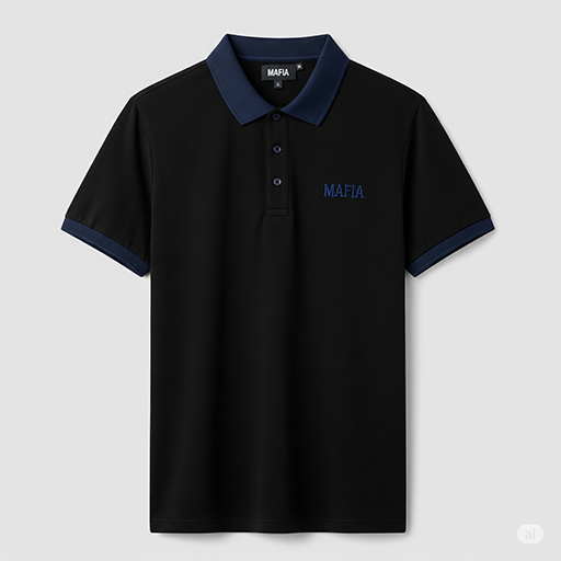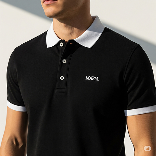 সাদা কন্ট্রাস্ট: কালো পোলো শার্টে সাদা কলার, কাফ এবং সাদা 'Mafia' লোগো, যা একটি ক্লাসিক এবং পরিশীলিত লুক দেয়।