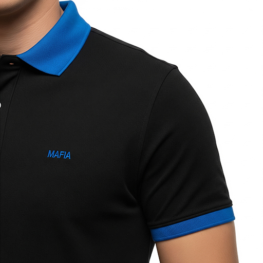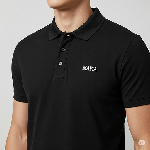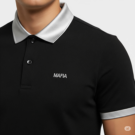 সাদা কন্ট্রাস্ট: কালো পোলো শার্টে সাদা কলার, কাফ এবং সাদা 'Mafia' লোগো, যা একটি ক্লাসিক এবং পরিশীলিত লুক দেয়।