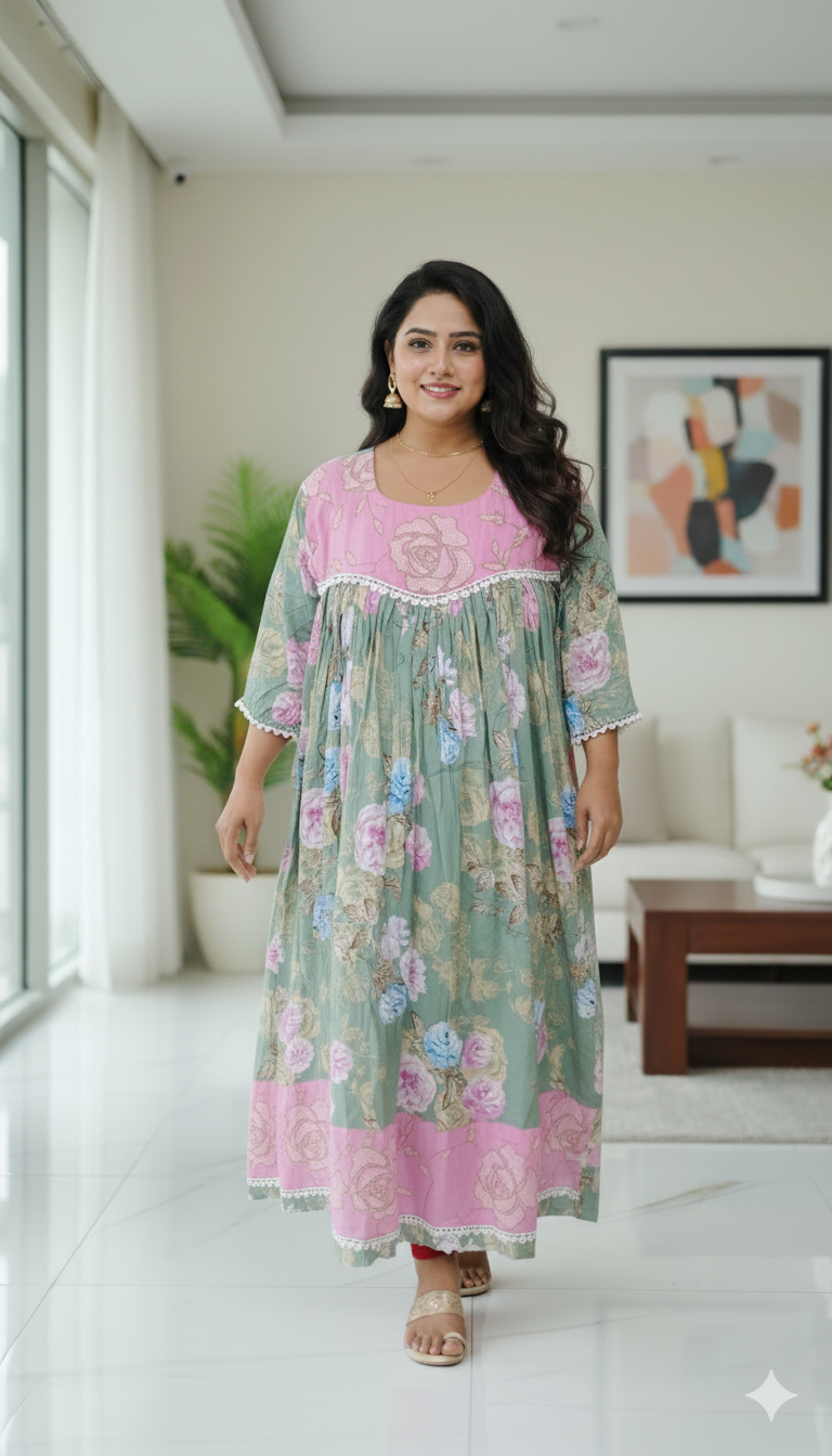 স্টাইলিশ ও ফ্লোই: ঢোলাঢোলা (A-line) কাটের কারণে পেটের বৃদ্ধি সত্ত্বেও আরামদায়ক ও স্টাইলিশ দেখায়।