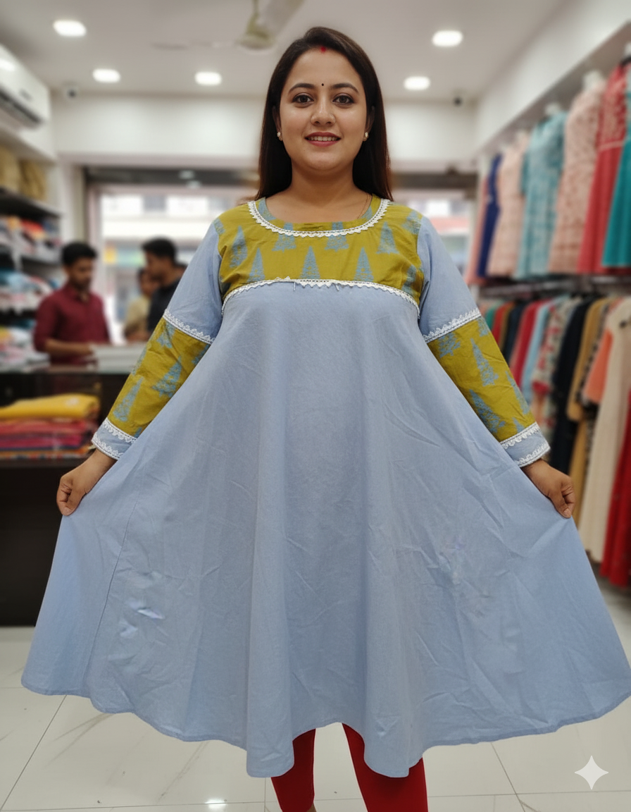 স্টাইলিশ ও ফ্লোই: ঢোলাঢোলা (A-line) কাটের কারণে পেটের বৃদ্ধি সত্ত্বেও আরামদায়ক ও স্টাইলিশ দেখায়।