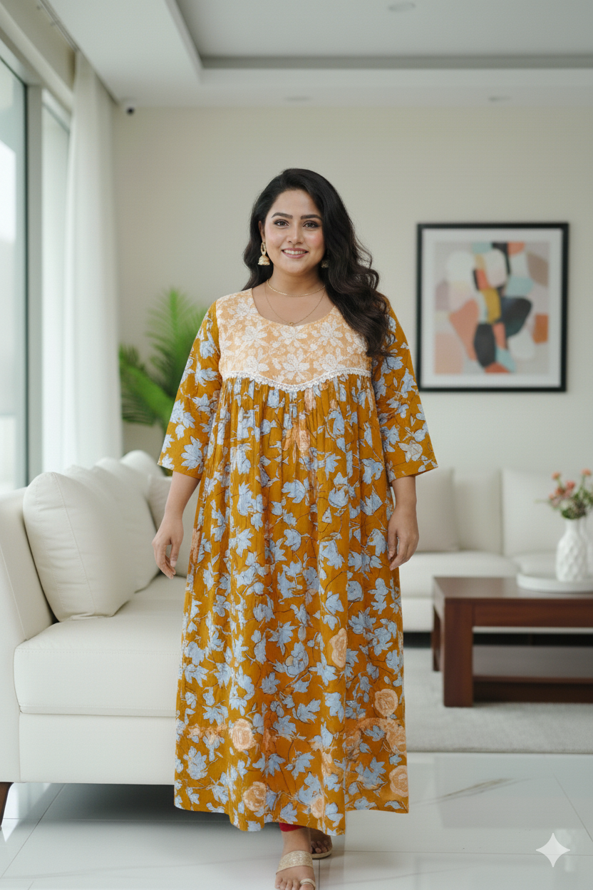 স্টাইলিশ ও ফ্লোই: ঢোলাঢোলা (A-line) কাটের কারণে পেটের বৃদ্ধি সত্ত্বেও আরামদায়ক ও স্টাইলিশ দেখায়।
